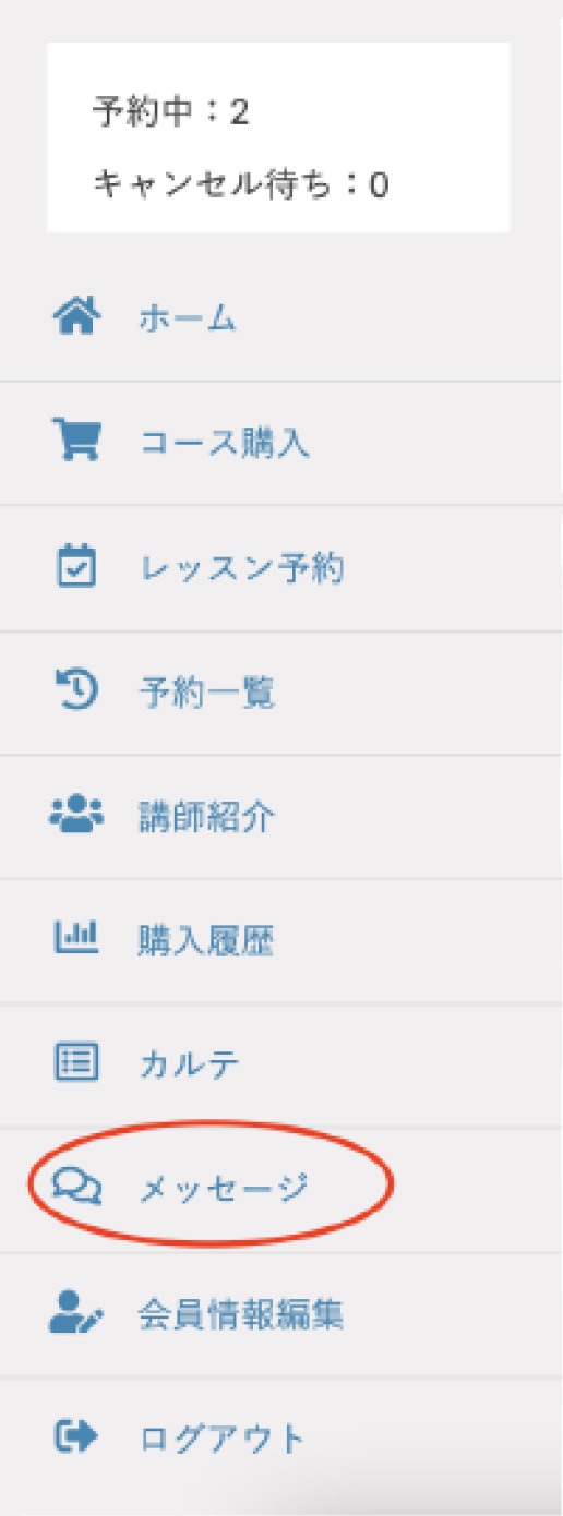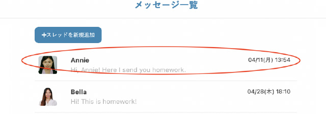 以前にメッセージを送信したことがある講師は下記のように表示されます。講師名をクリックをすると、講師とのメッセージ画面に入ります。→ ③ へ
