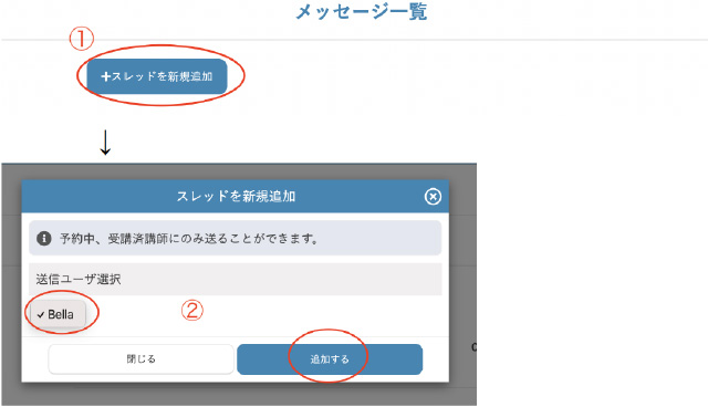 初めてメッセージを送信する講師は、下記①スレッドを新規追加をクリックし、②送信ユーザを選択し、追加するをクリックします。